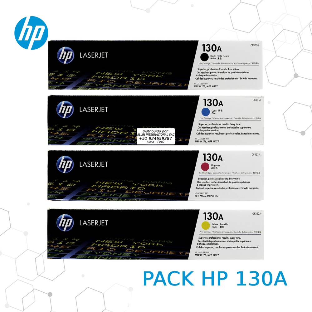 Palabras clave: Kit Toner HP 130A, CF350A CF351A CF352A CF353A, Pack de cartuchos HP 130A, Combo toner HP M176 M177, Cartuchos originales HP Perú, Toner HP 130A precio, Venta kit HP 130A Lima, Comprar toner HP 130A online, HP 130A negro cian magenta amarillo, Recambio láser color HP, Suministros HP M176n M177fw, Toner HP 130A barato, HP 130A Perú envío gratis