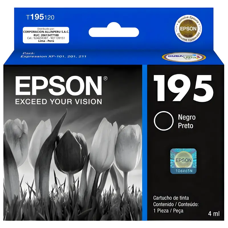 En AllinPerú todos los cartuchos se despachan en su empaque original sellado de fábrica: usted recibe exactamente lo que muestra la foto, sin remanufacturados ni recargas. El cartucho Epson 195 Negro incluye 6 meses de garantía, y si tiene algún inconveniente con el producto, lo gestionamos sin trámites complicados. Hacemos envíos a todo el Perú con un tiempo de entrega de 2 días hábiles, desde Lima hasta regiones. Trabajamos con productos originales porque sabemos que un cartucho incompatible puede dañar los cabezales de su impresora y generar un costo mayor a largo plazo.