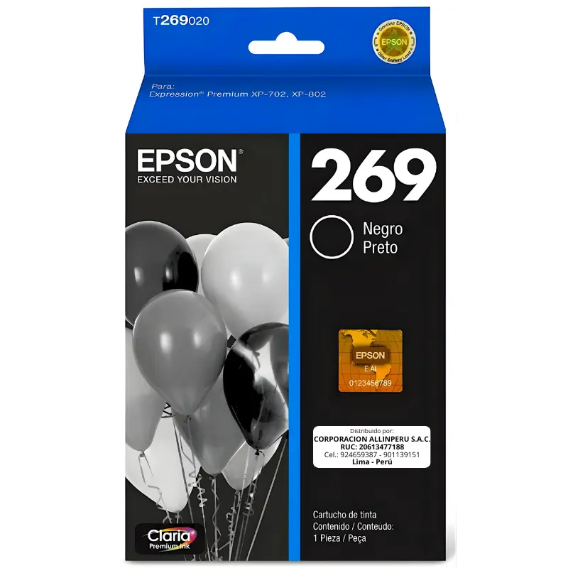 En AllinPerú cada cartucho Epson T269020-AL sale de nuestro almacén sellado de fábrica: usted recibe exactamente lo que aparece en la ficha, sin manipulación previa. Despachamos en 2 días hábiles a todo el Perú con seguimiento desde la confirmación del pedido. Todos nuestros productos originales incluyen garantía de 6 meses, y antes de comprar puede consultarnos sobre compatibilidad con su modelo de impresora. Sin condiciones ocultas.
