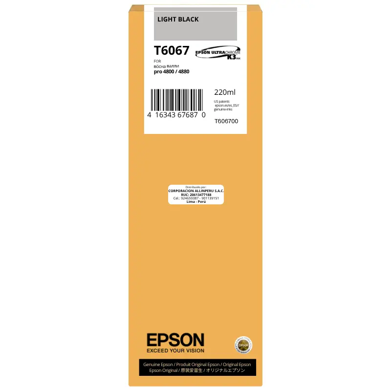 La tinta Epson T6067 Light Black 220ml es un cartucho de tinta pigmentada original, fabricado para las impresoras Epson Stylus Pro 4800 y 4880. Utiliza la tecnología UltraChrome K3, el sistema de pigmentos de tres niveles de negro desarrollado por Epson para producción fotográfica y gráfica de alto nivel.