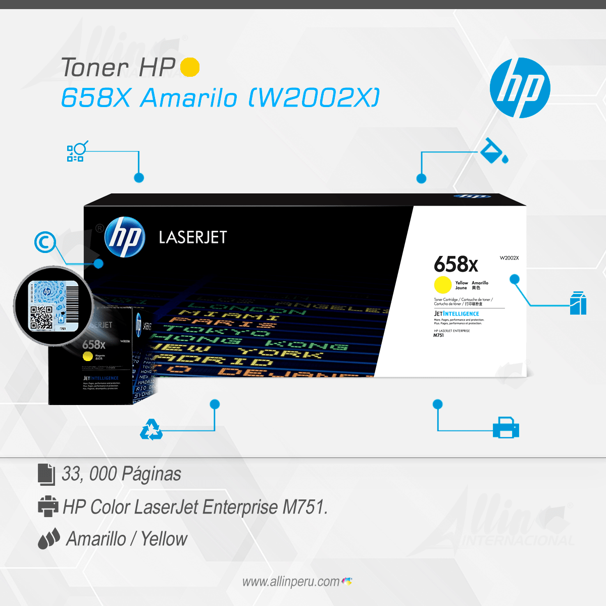 Palabras clave: Toner HP 658X Amarillo, W2002X, Toner HP LaserJet M751, Cartucho Yellow HP 658X, Toner Alto Rendimiento HP, Suministros Originales HP, Toner para HP Color LaserJet M751, Precio Toner HP 658X, Venta Toner HP Perú, Toner HP Lima, Compatibilidad HP M751dn