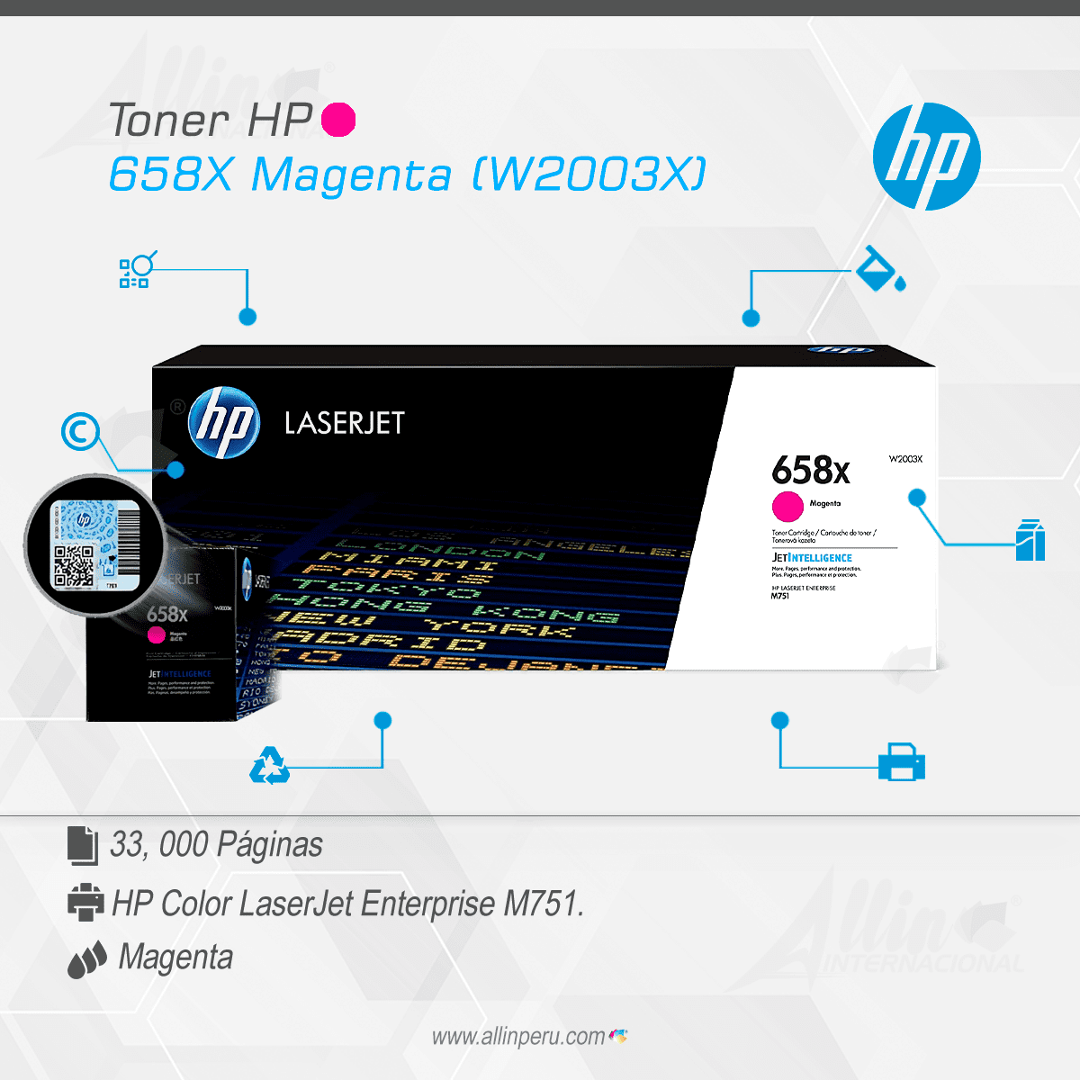 Palabras clave: Toner HP 658X Magenta, W2003X, Toner HP LaserJet M751, Cartucho Magenta HP 658X, Toner Alto Rendimiento HP, Suministros Originales HP, Toner para HP Color LaserJet M751, Precio Toner HP 658X, Venta Toner HP Perú, Toner HP Lima, Compatibilidad HP M751dn