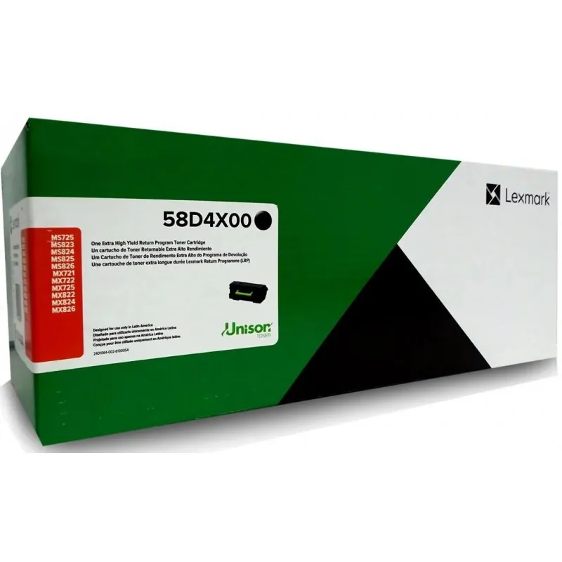 El 58D4X00 rinde 35,000 páginas (extra alto rendimiento), el 58D4H00 rinde 15,000 páginas (alto rendimiento) y el 58D4U00 rinde 55,000 páginas (ultra alto rendimiento). Los tres son compatibles con los mismos modelos Lexmark MS/MX y pertenecen al Programa de Retorno.