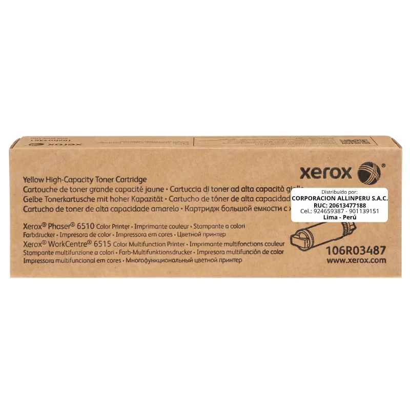 El tóner Xerox 106R03487 Yellow High Capacity es el cartucho amarillo de alta capacidad fabricado por Xerox para las impresoras láser color Phaser 6510 y WorkCentre 6515. Rinde 2400 páginas bajo el estándar ISO/IEC 19798 al 5 % de cobertura por página, lo que lo ubica en la categoría de alta capacidad frente al cartucho estándar de la misma gama.