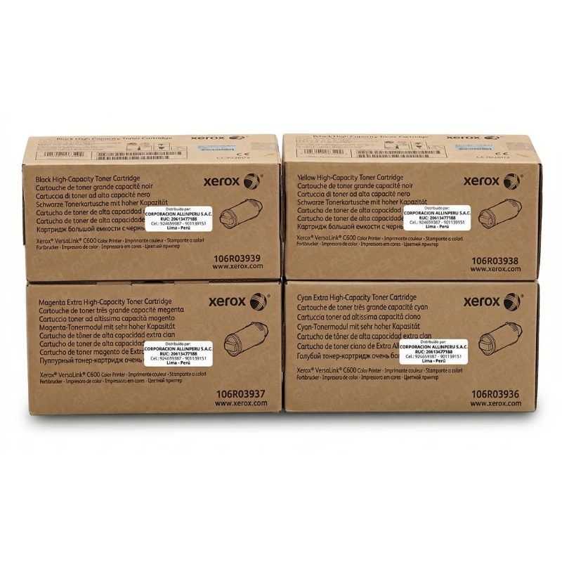 Este kit está pensado para oficinas y grupos de trabajo que imprimen en volumen y no pueden permitirse parar por falta de insumos. Con cuatro cartuchos de gran capacidad disponibles al mismo tiempo, la impresora mantiene producción continua sin reemplazos frecuentes. La tecnología de tóner láser de Xerox produce texto nítido, líneas finas bien definidas y colores uniformes desde la primera hasta la última página. Cada cartucho incluye un chip inteligente que la impresora lee de inmediato: se inserta, se cierra la tapa y se imprime. No requiere configuración adicional. El pack viene en caja de cartón corrugado individual por cartucho, con guía de reciclaje incluida.